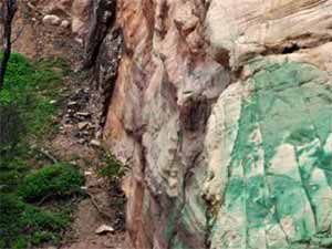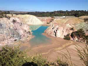 Leaching of minerals from rocks happens naturally in the environment. Groundwater that is slightly acidic or alkaline will dissolve minerals into solution which are then transported through rocks pore spaces and the result is often visible as stains on the outside of rock. There is much evidence of this in many abandoned copper mines across South Australia and Australia, where there is visible green and blue staining on the rocks and pit walls.